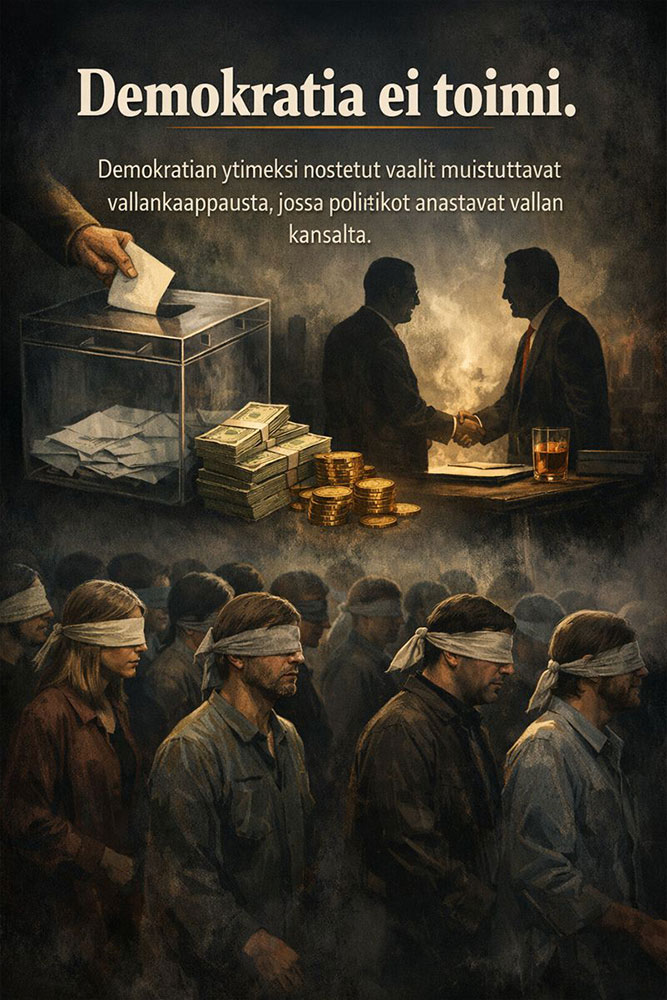 Demokratiassa puolueet kilpailevat enemmistöstä. Siksi ne lähestyvät toisiaan. Lopputulos on keskinkertaisuus, jossa kaikki ovat “vahvasti samaa mieltä” asioista, joita kukaan ei ole oikeasti ajatellut loppuun. Tämä ei synnytä pehmeyttä, vaan kovan enemmistövallan, joka murskaa poikkeavat.