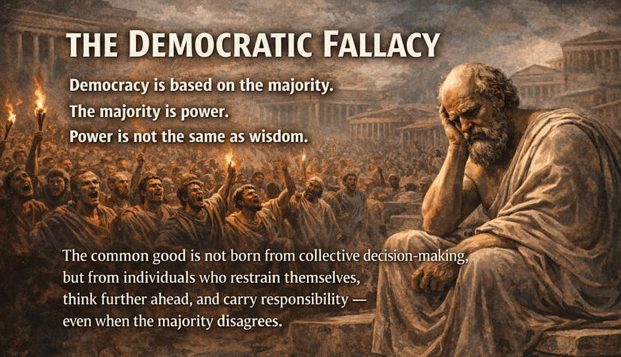 Demokratia ei tuhoa itseään pahuudella vaan banaaliudella. Kun järkeä ei vaadita vallan ehdoksi, valta päätyy mielipiteille. Kun kaikki mielipiteet julistetaan yhtä arvokkaiksi, mikään ei ole enää vastuullista.