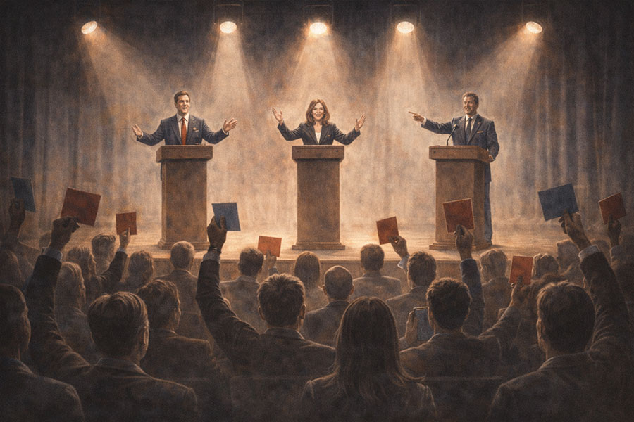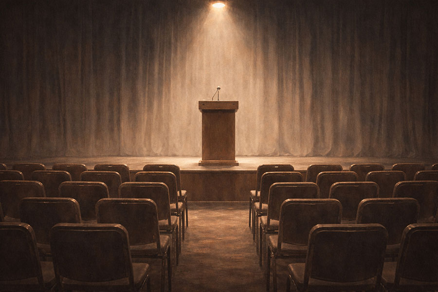 Kun valta muuttuu esitykseksi, vastuu katoaa. Johtaminen ei perustu ihmisyyteen tai eettiseen kykyyn, vaan näkyvyyteen, retoriikkaan ja rooleihin. Päätöksenteko irtoaa seurauksista ja politiikasta tulee performanssi.