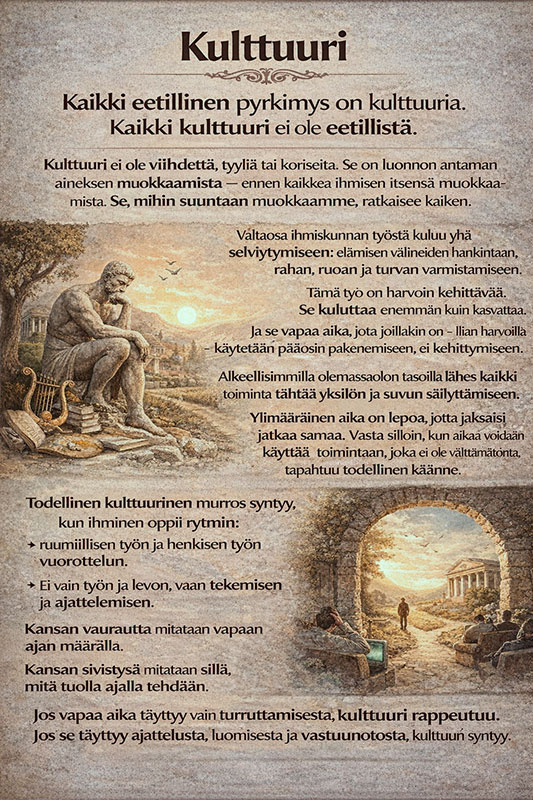 Kulttuuri ei ole viihdettä, tyyliä tai koristeita. Se on luonnon antaman aineksen muokkaamista- ennen kaikkea ihmisen itsensä muokkaamista. Se, mihin suuntaan muokkaamme, ratkaisee kaiken.
