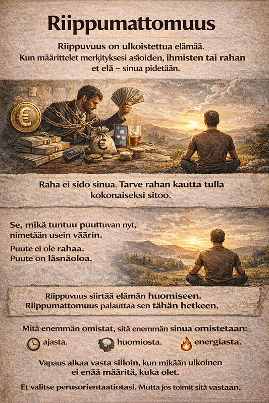 Riippumattomuus merkitsee itsensä vapauttamista riippuvuuden tarpeesta. Menestystä sisäisenä prosessina ei voida mitata omaisuuden perusteella.