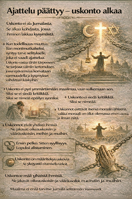Historiallisesti uskonto on ollut vallan liittolainen. Kun Jumala sidotaan valtioon, valta muuttuu koskemattomaksi. Kun laki esitetään jumalallisena, sitä ei saa kyseenalaistaa. Tässä vaiheessa ajattelu ei ole enää vaarallista se on kiellettyä.